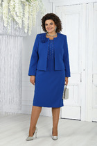 Комплект женский состоит из блузона и сарафана. Сарафан полуприлегающего силуэта, на бретелях, со средним швом по спинке, который заканчивается разрезом. По переду нагрудные вытачки, в боковых швах обработаны карманы. Блузон свободного кроя со спущенной линией плеча. Втачной одношовный рукав с регулируемой длиной с помощью хлястика. По переду накладные карманы. По спинке кокетка. Воротник стояче-отложной с отрезной стойкой.