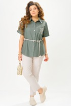 Комплект брючный состоит из жакета и брюк. Жакет полуприлегающего силуэта с центральной застежкой  на петли и пуговицуы, по спинке средний шов, по переду-кокетка , нагрудные вытачки, накладные карманы. Рукав втачной, двухшовный. Воротник стояче-отложной с открытыми бортами. Брюки широкие. Верхний срез обработан поясом с резинкой, застежка на тесьму-молнию, петлю и пуговицу. На задней половинке вытачки, на передней половинке складки, в боковых швах карманы. По поясу-шлевки.