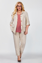 Блузон с цельнокроенным рукавом. По переду средний шов, по низу разрез с завязками. По горловине вырез, фикисруется петлей и пуговицей. По спинке средний шов. По боковым швам разрезы. По низу рукава разрезы с манжетом с застежкой на петли и пуговицы.