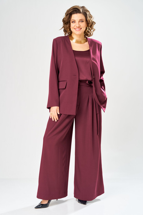 Комплект брючный состоит из жакета, топа и брюк. Жакет прямого силуэта с застежкой на петлю и пуговицу. Спинка со средним швом. Перед с боковыми карманами с клапаном. Рукав втачной 2-х шовный. Горловина V-образной формы. Жакет на подкладке. Топ из отделочной ткани с вытачками по переду и бретельками с регулировкой длины. Брюки прямые широкие с карманами в боковых швах, по переду застрочены складки и молния. Пояс по спинке на резинке, по переду с завязками.