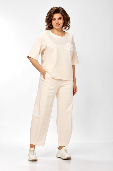 Комплект брючный состоит из майки и брюк. Майка свободного кроя, рукав реглан длиной до линии локтя, горловина обработана бейкой, по переду отделочный карман. Брюки широкие с заужением к линии низа. На задней половинке-кокетка, отрезная боковая часть. В рельефном шве передней половинки-карманы. Верхний срез обработан поясом с резинкой. Шлевки из отделочной ткани, съемный шнур-пояс. В качестве отделки используются детали и фурнитура.
