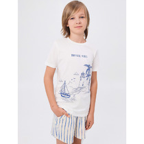 Костюм для девочки, состоящий из джемпера и и шорт. Джемпер - из гладкокрашеного полотна, с принтом в центре переда, свободного покроя, укороченный, с длинными втачными рукавами и горловиной овальной формы, обработанной втачной планкой. По шву втачивания планки настрочена отделочная строчка. Шорты - из полотна с набивным рисунком, средней длины, на притачном поясе с эластичной тесьмой внутри. Средний шов переда выполнен с имитацией застежки "гульфик" с тремя декоративными пуговицами.