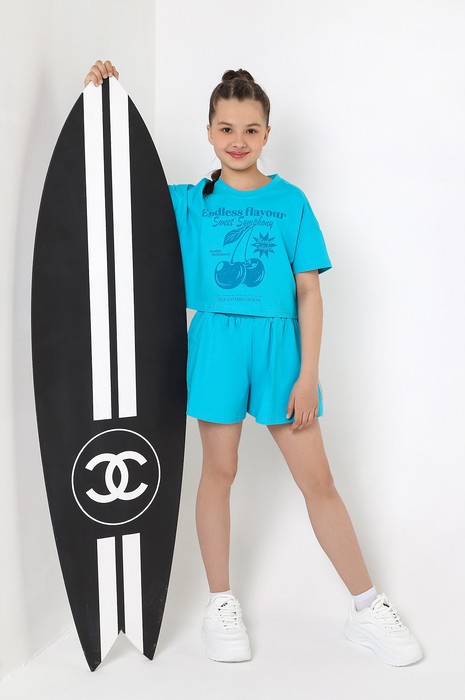 Эффектный костюм для девочки из хлопкового полотна с лайкрой. Футболка с принтом в модной стилистике, свободная, со спущенной линией плеч, округлым вырезом горловины, короткими рукавами. Шорты-юбка с боковыми карманами, на притачном поясе с отстроченной эластичной тесьмой.