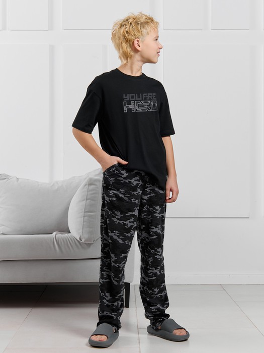 Костюмдля мальчика, состоящий из футболки и брюк. Футболка однотонная с принтом на груди; модель свободная, со спущенной линией плеч, овальным вырезом горловины. Брюки из полотна с набивным рисунком эксклюзивного дизайна, прямые, с боковыми карманами с обтачными входами, на притачном поясе с отстроченной эластичной тесьмой.