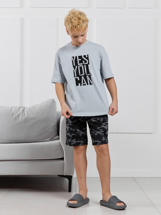 Костюм для мальчика, состоящий из футболки и шорт. Футболка однотонная с принтом на груди; модель свободная, со спущенной линией плеч. Шорты из полотна с набивным рисунком эксклюзивного дизайна, с боковыми карманами с обтачными входами, на притачном поясе с отстроченной эластичной тесьмой.