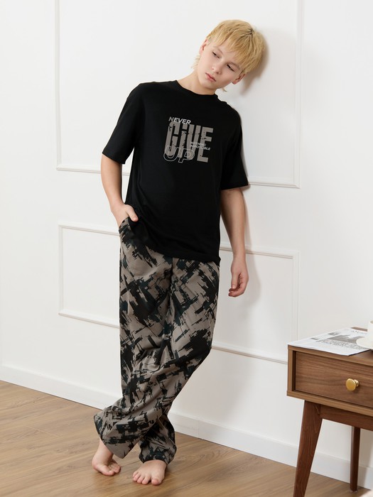 Костюм для мальчика, состоящий из футболки и брюк. Футболка однотонная с принтом на груди; модель свободная, со спущенной линией плеч, овальным вырезом горловины. Брюки из полотна с набивным рисунком эксклюзивного дизайна, прямые, с боковыми карманами с обтачными входами, на притачном поясе с отстроченной эластичной тесьмой.