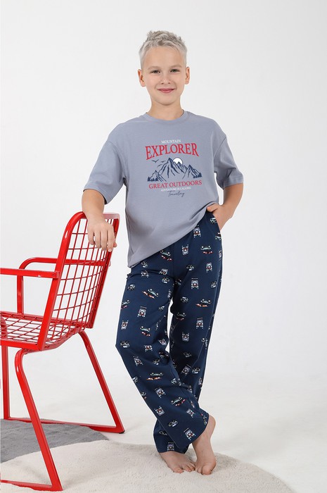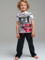 Костюм для мальчика ,состоящий из футболки и брюк. Футболка - из гладкокрашеного полотна "кулирка", классического покроя, с короткими втачными рукавами, горловиной овальной формы, обработанной втачной планкой, и принтом вцентре переда, выполненным в технике шелкографии. Брюки - из полотна с набивным рисунком, прямого силуэта, на притачном поясе с эластичнойтесьмой внутри и карманами в боковых швах, входы в которые окантованы основным материалом.