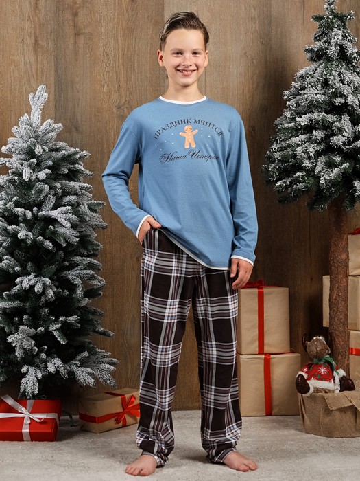 Костюм для мальчика из трикотажного полотна "кулирка" в комбинации двух видов: гладкокрашенного и с рисунком в крупную клетку, сочетающихся между собой по цвету, состоящий из джемпера и брюк. Джемпер - из гладкокрашеного полотна, свободного покроя, с длинными втачными рукавами и приспущенными плечами, с горловиной овальной формы и тематическим принтом, выполненным в технике шелкографии. Горловина, нижние срезы рукавов и низ изделия обработаны подгибкой с отделочным широким кантом контрастного цвета. Брюки - из полотна в клетку, свободного покроя, прямые, на притачном поясе с эластичной тесьмой внутри, с карманами в боковых швах. Нижние срезы обработаны подгибкой.