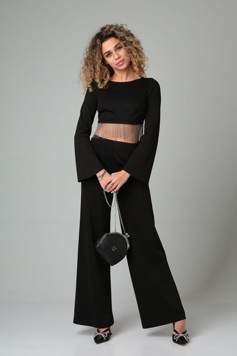 Очаровательный, эффектный, комплект 2-ка из высококачественной трикотажной ткани. Укороченный Топ украшеный тесьмой "каскад ", вырез горловины лодочка. Рукав втачной, расширен к низу. В боковом шве потайная молния. Брюки на завышеной талии, рсширены от линии бедра, пояс на обтачке, застежка молния в боковом шве.