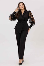 Настоящее произведение искусства!!! Уверенность, элегантность, этого костюма делает его идеальным выбором для важных деловых встреч, корпоративных мероприятий и незабываемых вечерних выходов. Изысканный комплект тройка выполнен из качественной стрейчевой ткани. Топ облегающего силуэта с рельефами по полочке, по спинке выточки и потайная молния в среднем шве. Брюки клёш от колена с за утюженым кантом, которые подчеркнут вашу утонченность и изысканность. Застежка молния по переду, по бокам прорезные карманы, пояс со шлевками и эластичной лентой по бокам. Жакет "BLAZER" без застежки на подкладке, рукав втачной расширенный к низу с декоративной шлицей. Изящность комплекту придает контрастная отделка воротника, планок, разреза шлицы и съемного декоративного цветка ручной работы подчеркнет вашу неотразимость и безупречный вкус.