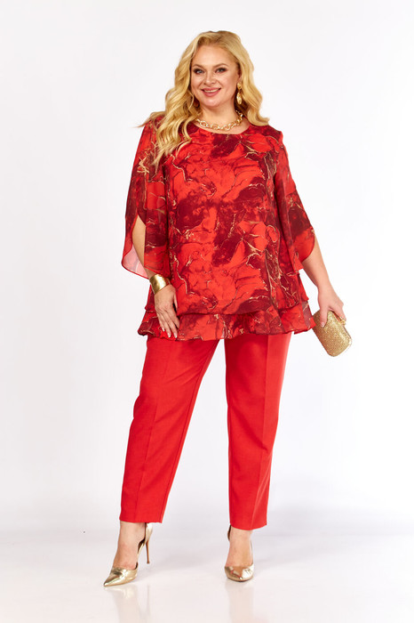 Брючный комплект предназначен для элегантных женщин. Блуза сводного кроя из принтованного шифона, что придает уникальность стилю своими красками. На полочке нагрудные вытачки, вырез горловины аккуратной округлой формы. Рукав втачной, свободный, низ присборен. Брюки слегка зауженные к низу. Пояс притачной, частично на резинке.