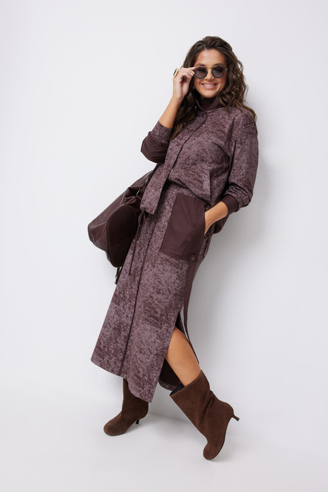 Комплект женский состоящий из бомбера и юбки. Бомбер прямого силуэта со спущенной линией плеча, на притачной манжете. Воротник-стойка, перед с центральной  бортовой застежкой на кнопки и боковыми карманами ввиде листочки с втачными концами. Низ бомбера выполнен ввиде кулисы. Спинка с декоративным настрочным элементом. Юбка прямого силуэта с притачным поясом на резинке и разрезами в боковых швах. Перед со средним швом. Перед и спинка с накладными фигурными карманами. Бомбер и юбка с отделочными элементами ввиде тесьмы из основной ткани, пристегивающиеся на кнопку. Край борта, воротник, средний шов и карманы юбки выполнены с открытым срезом.