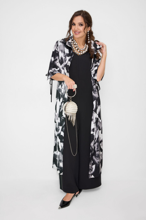 Комплект женский, состоящий из комбинезона и шазюбля. Комбинезон прямого силуэта. Вырез горловины по переду и спинке V-образный. Застежка в среднем шве спинки на потайную молнию. В боковых швах карманы. Шазюбль прямого силуэта. Состоит из трех видов ткани. Застежка на петли и пуговицы на планке. Воротник рубашечного типа. Рукав втачной, заканчивается манжетой с завязками.  По спинке кокетка. Нижняя часть спинки выполнена из сетки. В боковых швах высокие разрезы и хлястики, которые помогают регулировать прилегание.