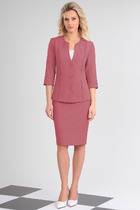 Комплект женский, состоящий из блузона и брюк. Блузон прямого силуэта со спущенной линией плеча. Рукав одношовный, длинный, заканчивающийся открытым срезом. Вырез горловины V-образный, с притачной планкой и декоративным элементом из основной ткани. Перед с асимметричными подрезами и декоративными элементами. Низ блузона выполнен открытым срезом. Брюки свободного силуэта, заужены к низу. Пояс притачной, с резинкой. Перед брюк с боковыми карманами. Брюки с фигурными подрезами. Подрезы и низ брюк выполненными швами с открытыми срезами.