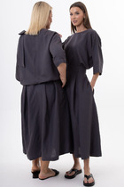 Комплект женский, состоящий из рубашки и юбки. Рубашка с длинным цельнокроеным рукавом, заканчивающимся притачной манжетой (на застежку пуговицу). Воротник стояче-отложной. Перед рубашки с застежкой на планку, петли и пуговицы. Перед с накладными карманами. В боковых швах разрезы. Юбка прямого силуэта, длинная, состоящая из двух видов ткани. Выполнена, как имитация двойной юбки. Верх юбки на обтачке, застежка - молния в среднем шве спинки. Нижняя юбка с высокими боковыми разрезами.