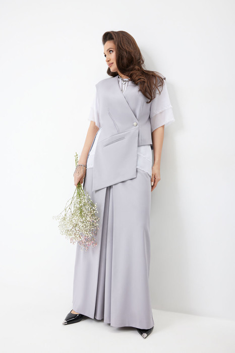 Комплект женский, состоящий из жилета, брюк и блузы. Жилет прямого силуэта с V-образным вырезом горловины имеет спинку со среднем швом и асимметричным низом.  Перед с двубортной застежкой на петли-пуговицы. Низ переда асимметричный и разноуровневый. На средней части переда имитация кармана "в рамку", добавляющая интересный акцент к модели. Блуза прямого силуэта с круглым вырезом и коротким втачным одношовным рукавом выполнена с двойными деталями. Перед, спинка и рукав имеют разноуровневый низ с открытым срезом. Брюки прямого, свободного силуэта, с притачным поясом и резинкой в области боковых участков переда и спинки обеспечивают комфорт и хорошую посадку. Задняя часть брюк с талиевыми вытачками, а перед — с боковыми карманами.