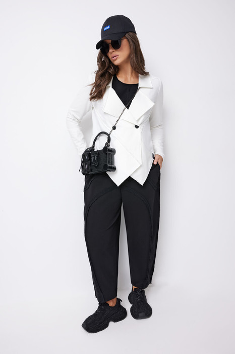 Комплект женский, состоящий из жакета, топа и брюк. Жакет прямого силуэта с двубортной застежкой на петли-пуговицы и воротником пиджачного типа. По переду — кокетка, подрезы и накладные карманы. Спинка с кокеткой и притачной планкой по низу. Рукава втачные длинные. Низ изделия разноуровневый. В модели применены швы с открытыми срезами. По переду и спинке нашиты фирменные логотипы с названием бренда. Топ прямого силуэта с центральными швами по переду и спинке. Топ имеет планки с открытыми срезами у горловины и пройм, а также разрезы в боковых швах. На передней части расположен фирменный логотип. Брюки свободной формы (бананы) с притачным поясом, резинкой и декоративным шнуром. Брюки с заниженной линией сидения, в боковых швах карманы, на задней части брюк с левой стороны декоративный накладной карман. Передние рельефы выполнены фигурными линиями.