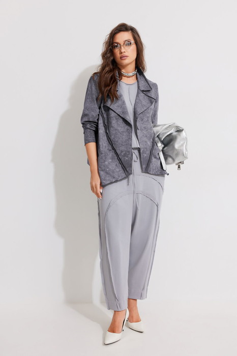 Комплект женский из жакета, топа и брюк.  Жакет прямого силуэта с однобортной застежкой на петлю и пуговицу. Воротник пиджачного типа.  Передняя часть с кокеткой, подрезами и накладными карманами, спинка также имеет кокетку и притачную планку по низу. Втачной длинный рукав и разноуровневый низ придают модели динамичный стиль. В жакете использованы швы с открытыми срезами, а на передней части и спинке расположены фирменные логотипы, что подчеркивает эксклюзивность модели. Топ прямого силуэта с центральными швами по переду и спинке. Топ имеет планки с открытыми срезами по горловине и проймам, так же дополнен боковыми разрезами и фирменным логотипом на передней части. Брюки свободной формы (бананы) на притачном поясе с резинкой и декоративным шнуром, с заниженной линией сидения, обеспечивают комфорт и свободу движений. В боковых швах расположены карманы, а на задней части слева — декоративный накладной карман. Передняя часть с фигурными  рельефами, а передние и боковые швы оформлены с открытым срезом, что придает образу индивидуальность.