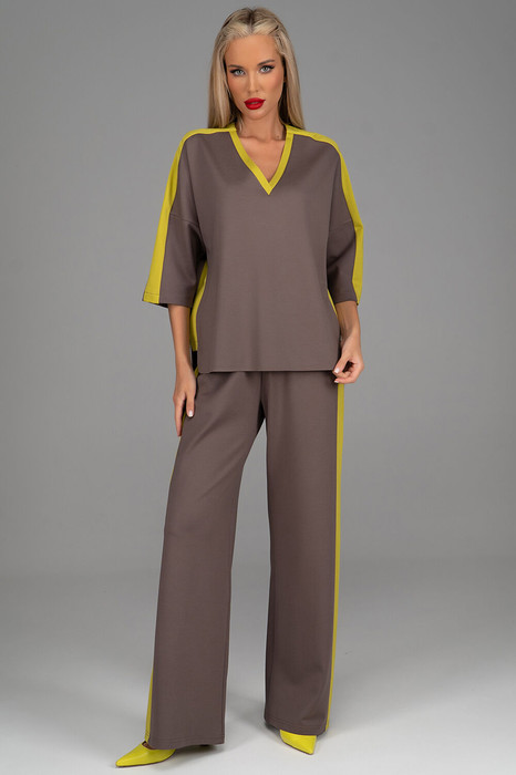 Откройте для себя костюм, который сочетает в себе стиль и комфорт. Этот костюм с брюками станет вашим незаменимым спутником в любое время года. Он обеспечивает легкость и свободу движений. Костюм украшен эффектными вставками, добавляющими нотку шика в ваш повседневный образ.