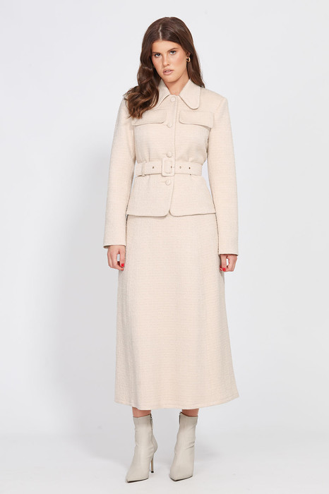 Комплект: жакет + юбка. Комплект выполнен из твида. Жакет полуприлегающего силуэта, длиной выше линии бедер. Застежка спереди центральная бортовая на пуговицы. Спинка со средним швом и талиевыми вытачками. Рукав втачной, двухшовный. Жакет на притачной по низу подкладке. Юбка расширена к низу, на притачном поясе, длиной миди. Застежка в левом боковом шве на пуговицу и потайную молнию. Переднее и заднее полотнище состоит из трех клиньев. Юбка на отлетной по низу подкладке. В комплект входит ремень из основной ткани с обтяжной пряжкой.