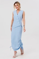 Комплект: джемпер + брюки. Комплект выполнен из однотонного фактурного трикотажного полотна. Джемпер прямого силуэта, длиной до линии бедер. Перед и спинка цельные. Горловина обработана капюшоном с завязками. Плечевой шов спущен. Рукав одношовный, перед короче спинки. Джемпер декорирован настрачной нашивкой из натуральной кожи. В боковых швах разрезы. Брюки прямого кроя, на цельнокроенном поясе с эластичной тесьмой.