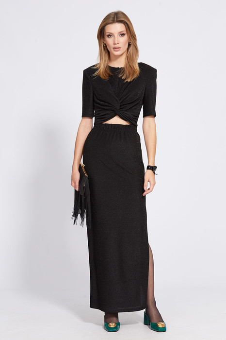 Комплект: блузка + юбка. Комплект выполнен из трикотажного полотна с люрексом. Блузка приталенного силуэта длиной до линии талии. Спереди средний шов с застежкой на потайную молнию, перекрут со сборками по боковыми швам. Спинка цельная. Рукав втачной одношовный, длиной до линии локтя. Блузка с плечевыми накладками, на подкладке. Юбка длиной макси, зауженная к низу. Переднее и заднее полотнища цельные. В левом боковом шве разрез. Юбка на цельнокроеном поясе. Юбка без подкладки.