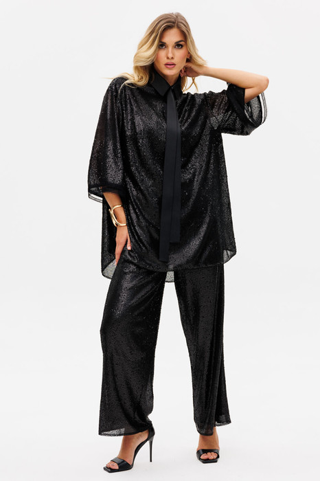Комплект: блузка+брюки. Комплект выполнен из трикотажного полотна в пайетки. Блузка прямого силуэта, длиной ниже линии бедер. Перед и спинка цельные. Спереди застежка на пуговицы. Стояче-отложной воротник с отрезной стойкой. Плечевой шов удлинен. Рукав рубашечного покроя, одношовный, длиной ниже линии локтя. Низ рукава декорирован тесьмой-кружевом. В комплект входит съемный галстук. Галстук и воротник выполнены из атласа. Низ блузки фигурной формы. Блузка на отлетной по низу подкладке. Брюки прямого силуэта, длиной до линии щиколотки, на притачном поясе с эластичной тесьмой. В боковых швах карманы. Брюки на отлетной по низу подкладке.