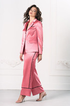 Костюм свободного прилегания выполнен из мягкой немнущейся ткани. Блузон с капюшоном и цельнокроеным рукавом по низу которого кулиса с завязками. По полочки блузона выполнен карманы "рамки", низ блузона затягивается на кулису. Брюки- шаровары на притачном поясе с резинкой, по боковым брюк карманы. низ брюк на кулисе. Декорированы брюки густой дизайнерской вышивкой "кошка" Длина брюк 100 см. длина блузона-62 см.