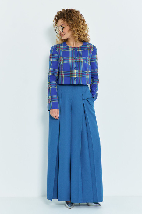 Костюм женский 2х-предметный выполнен из костюмной ткани. Жакет свободного кроя, укороченный  рукав-втачанный, длинный. Горловина округлая. Застежка-петли- пуговица. Брюки палаццо- со складками, средней посадки на притачном поясе с резинкой. Застежка молния на гульфике в боковых швах брюк имеются небольшие карманы.
