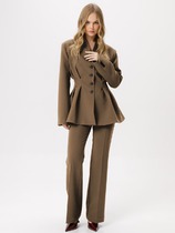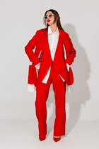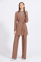 Костюм женский 2х-предметный, состоит из жакета и брюк. Жакет полуприлегающего силуэта выполнен из сочетания тканей Джинса и костюмной ткани, по полочке жакета расположена накладная деталь с функциональным прорезным карманом "рамка", и декоративные фальш-карманы в области груди. Рукав втачной длинный. Горловина обработана плоско лежащим воротником-стойкой. Застежка жакета - потайная (супатная) на петли-пуговицы. Жакет на полной подкладке. Брюки классического кроя, с небольшим клешем к низу, с высокой посадкой, выполнены из джинсовой ткани. Пояс в брюках втачной в боковых швах имеются карманы, застежка молния на гульфике и петля-пуговица. На задних полотнищах брюк расположена накладные карманы.