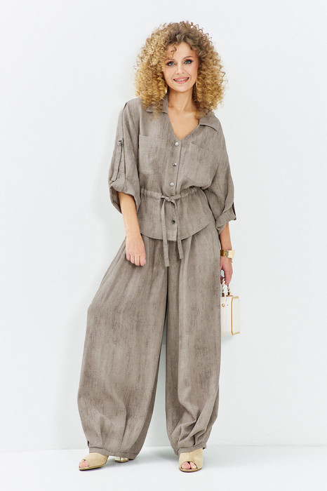 Костюм двойка состоит из блузона и брюк- шаровар. Блузон с аккуратным V-образным вырезом горловины и отложным воротником.на лифе изделия располжены накладные ккарманы и застежка на кнопки. Главный акцент — мягкий пояс-кулиска, который позволяет мгновенно превратить свободный силуэт в приталенный, подчеркивая талию. Рукава с патами позволяют регулировать длину, добавляя образу легкую небрежность.