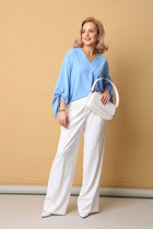 Свободная блуза А-силуэта, покроя реглан с круглым вырезом горловины. Низ изделия с отделочной полоской и бахромой.