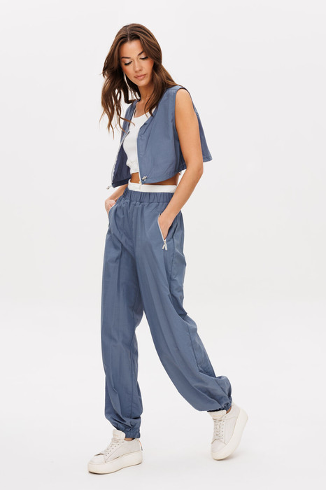 Брюки в свободном, расслабленном стиле, на эластичном поясе с прорезными карманами на молнии. Пояс с дополнительным эластичным поясом из трикотажного кашкорсе . Длина брюк около 102 см.