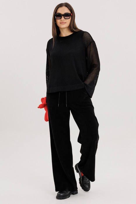 Рукав слегка расширенный к низу. Обтачка горловины из отделочного текстурного трикотажа.