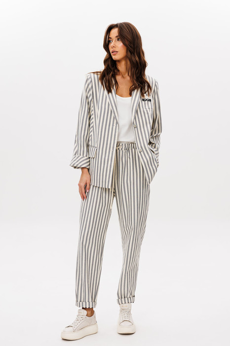 Совместимы ли официальность и комфорт, деловой или спортивный стиль? Судя по нашей модели эти противоположности отлично уживаются друг с другом. Мягкие, расслабленные брюки на резинке и свободный, упрямленный пиджак из трендовой льняной полоски - то, что подойдет вам в случае, если хочется создать комфортный образ.