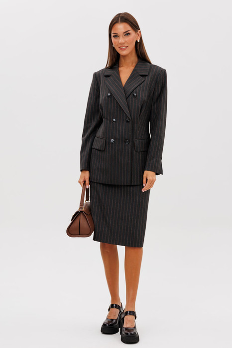 Жакет полуприлегающего силуэта, втачного покроя с двубортной застежкой и классическим английским воротником. Полочка с частично застроченной нагрудной вытачкой и прорезным карманом с клапаном. Спинка с центральным швом и эффектной баской сформированной мягкими бантовыми складками в области талии.