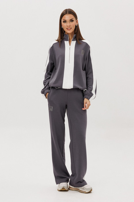 Контрастные лампасы на брюках, рукавах, по центру переда и низу придают модели особую динамичность и изысканность.