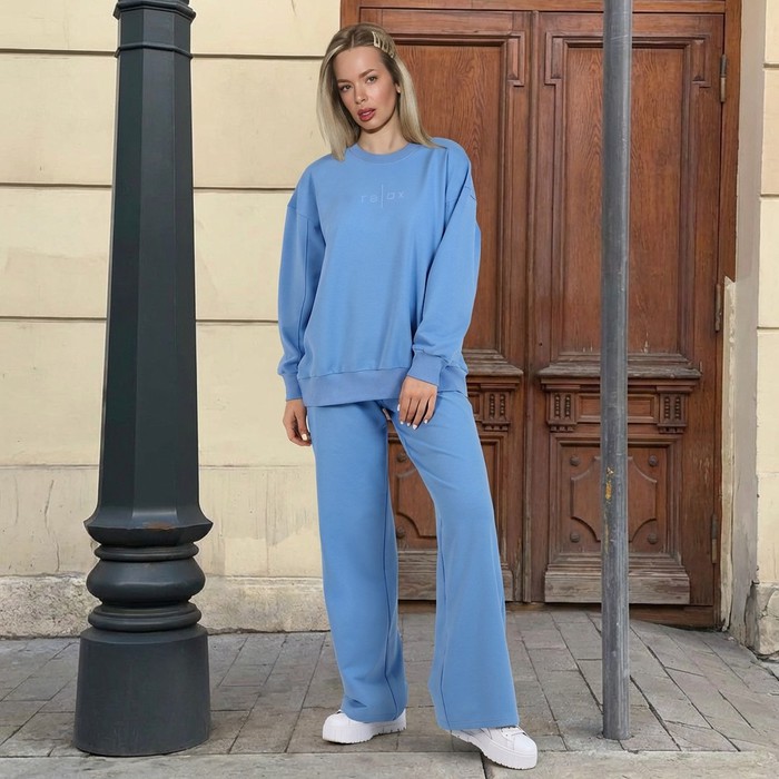 Костюм из гладкокрашеного трикотажного полотна «футер-двунитка», состоящий из джемпера и брюк. Джемпер - прямого силуэта, с длинными втачными рукавами, горловиной овальной формы, обработанной втачной планкой, притачным поясом и принтом на полочке, выполненным методом шелкографии. Манжеты рукавов, планка горловины и полупояса по низу изделия выполнены из эластичного полотна «рибана» в тон основному материалу, боковые швы смещены в сторону переда. Брюки – длинные слегка расширенные книзу, на притачном поясе с эластичной тесьмой внутри и карманами в боковых швах.