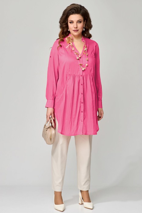 Комплект двойка "Медея". Туника женская, прямого силуэта. Выполнена из хлопковой ткани. Рукав втачной, длинный, по низу притачная манжета с застежкой на пуговицы. Длина рукава регулируется патой. Фигурный вырез горловины, оформленный отрезными планками. Застежка на пуговицах. Воротник стойка. По переду выполнены фигурные карманы с небольшой сборкой по верхнему краю. По линии талии подрез с небольшой сборкой. На спине изделия прямая кокетка, посередине бактовая складка. Низ изделия фигурный, по боковым швам выполнены разрезы. Джинсы - брюки, зауженные к низу, с застежкой на молнию и пуговицы, в боковом шве - карман, по спинке пояса - резинка.  Брюки со стандартной посадкой (средней).