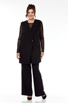 Комплект женский нарядный "Санда" летний для выхода и повседневного образа (блузка, брюки, топ). Блузка прямого силуэта, застежка однобортная, на кнопки, по горловине стойка, по полочке - нагрудная выточка. Спинка в блузке без шва, рукав одношовный 7/8. Низ блузки и рукава обработан швом в подгибку с закрытым срезом. Брюки - прямого силуэта, в боковом шве - карманы, пояс на резинке, низ брюк обработан швом в подгибку, с закрытым срезом. Топ с печатью на полочке, изготовлен топ из трикотажной ткани, полуприлегающего силуэта. По полочке топа - нагрудная выточка, проймы и горловина обработаны планкой, низ изделия обработан на распошивалке.