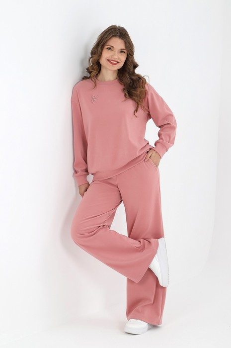 Костюм молодежный из гладкокрашеного трикотажного полотна «флис-сайкл», состоящий из джемпера и брюк. Джемпер – прямого силуэта, с длинными втачными рукавами, горловиной овальной формы, обработанной втачной планкой, притачным поясом понизу и принтом на полочке, выполненным в технике «шелкографии». Рукава – с притачными манжетами.Брюки – длинные, свободные, на притачном поясе с эластичной тесьмой внутри, карманами в боковых швах.