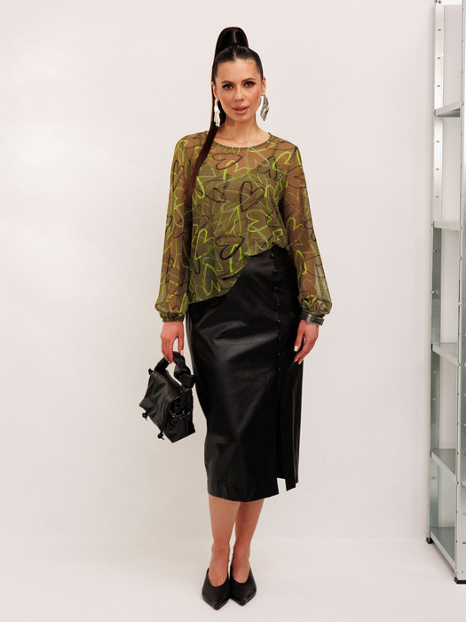 Данный комплект состоит из 3-х вещей- прозрачного лонгслива,топа и юбки.Все вещи данного комплекта можно носить отдельно,что является оченьпрактичным решением.Лонгслив выполнен из сетки с дизайном,полуприлегающего силуэта,Рукав расширен к низу и собран на сборку.Топ выполнен из атласа в цвет сетки.Юбка выполнена из экокожи с натуральной подложкой внутри,что придаст дополнительный комфорт при носке ( не электролизуется).Юбка прилегающего силуэта без пояса, застегиваетсяна потайную молнию.По переду имеется разрез с пуговицами из экокожи.