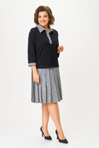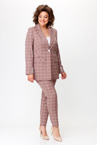 Брюки прямые, зауженые к низу, длинные. Карманы по переду с отрезным бочком. На задней половине брюк накладные карманы и кокетка в верхней части. Пояс притачной. Застежка по центру переда на" молнию" и пуговицу. Костюм оформлен отделочными строчками в цвет ткани.