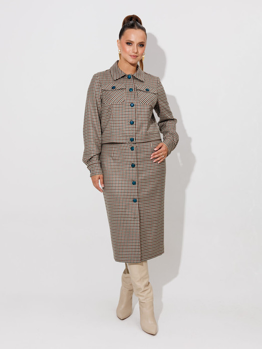 Костюм женский жакет+ юбка приталенного силуэта, выполнен из текстильного полотна костюмно- плательной группы.Перед с нагрудной вытачкой идущей от бокового шва, накладными карманами с клапаном.На планке расположены 5 пуговиц.Спинка со средним швом.По низу жакета обработан пояс.Воротник стояче отложной.Рукава одношовные заканчивающиеся манжетой.