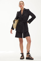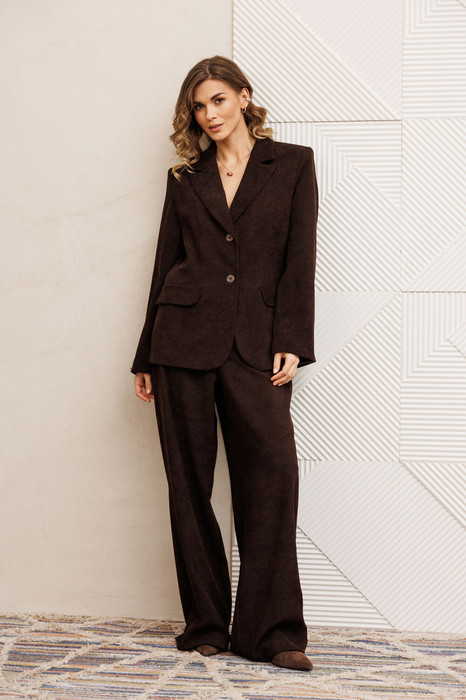 Костюм состоит из жакета и брюк. Жакет полуприлегающего силуэта из мягкой вельветовой  ткани приятного шоколадного цвета.  Застежка однобортная на две пуговицы, воротник пиджачного типа.  Перед с талиевой вытачкой, рельефом и декоративным клапаном. Спинка с рельефами из проймы и средним швом.  Рукав втачной двухшовный. Жакет на подкладке. Брюки палаццо с притачным поясом из мягкой вельветовой ткани. Спереди застежка гульфик на молнии и петлей и пуговицей по поясу. По задней частям брюк вытачки. Пояс с резинкой в боковых частях. Брюки с заутюженными стрелками. Длина жакета - 68 см, длина рукава жакета - 60 см. Длина брюк с учетом пояса - 109 см.