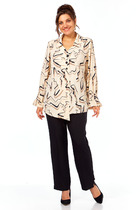 Джемпер прямого силуэта с воротником поло из плотной хлопковой ткани "двухнитка". Рукав втачной одношовный. По низу изделия, по низу рукава и по воротнику проложена отделочная строчка. Брюки палаццо с притачным поясом из мягкой вельветовой ткани. Спереди застежка гульфик на молнии и петлей и пуговицей по поясу. По задней частям брюк вытачки. Пояс с резинкой в боковых частях. Брюки с заутюженными стрелками. Длина джемпера- 66 см, длина рукава - 60 см. Длина брюк с учетом пояса - 109 см.
