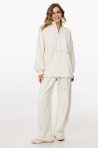 Костюм состоит из джемпера и брюк. Джемпер приталенного силуэта с воротником поло из трикотажного полотна. Рукав втачной одношовный.Брюки расширеные книзу на притачном поясе. По поясу настрочены шлевки. По передним и задним частям брюк вытачки. На задних частях брюк настрочены карманы. Карманы, вытачки, пояс, низ брюк отделаны отделочной строчкой. Длина брюк с учетом пояса - 109 см, длина джемпера - 57 см, длина рукава - 27 см.