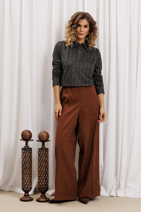 Костюм состоит из джемпера и брюк. Джемпер прямого силуэта из трикотажного змшевого полотна с тигровым рисунком. Перед с застежкой поло и нагрудными вытачками. По воротнику настрочена декоративная тесьма. Длина джемпера  - 61 см, длина рукава - 61 см.  Брюки палаццо с притачным поясом из мягкой вельветовой ткани. Спереди застежка гульфик на молнии и петлей и пуговицей по поясу. По задней частям брюк вытачки. Пояс с резинкой в боковых частях. Брюки с заутюженными стрелками. Длина брюк с учетом пояса - 109 см.
