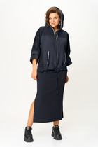 Джемпер с дизайнерскими, наклонными резами и на переде, и на спинке, выполненных из разных контрастных оттенков. Рукава визу имеют манжеты. Воротник-стойка, манжеты, низ джемпера выполнены из ткани-компаньена кошкорсе. На левом переде вышит логотип в цвет полоски. Брюки имеют современный крой и облегание, удобные карманы на передних половинка, притачной пояс и резинку внутри. Низ брюк присобран на резинку.