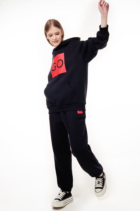 Женский тёплый уютный костюм. Подойдет для прогулок и отдыха. Изготовлен из футера с начесом, состоит из худи, покроя оверсайз и джоггеров. Худи имеет двойной капюшон и карман кенгуру. По центру переда контрастная печать GO. Рукава имеют притачную манжету. Манжеты рукавов и низ изделия выполнены из ткани- компаньона кошкорсе. Брюки немного зауженные и низ присобран на резинку. Передние половинки имеют удобные карманы. Пояс с резинкой и шнурком внутри. Пояс выполнен из кошкорсе.
